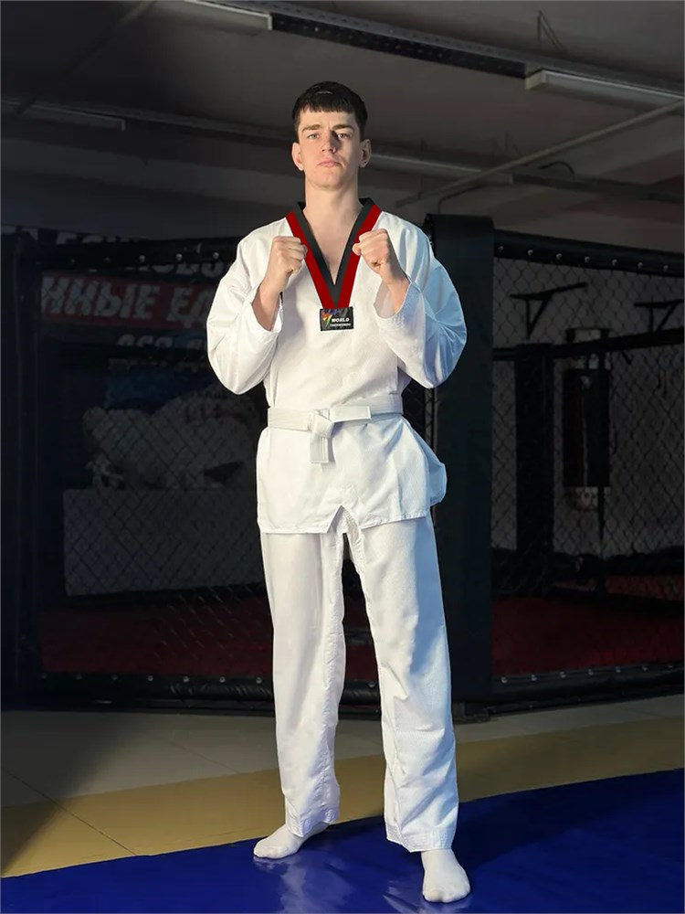 Добок для тхэквондо. Модель тренировочного кимоно, для начинающих спортсменов. Сделан из легкого, приятного на ощупь материала с рифленой структурой ткани, это комбинации смеси полиэстера и хлопока (55% хлопок – 45% полиэстер), хлопковые волокна путем укрепления полиэфирными нитями увеличивает свою прочность на растяжение, и долговечность в использовании, а так же благодаря полиэфирным волокнам позволяет выводит наружу повышенную влажность, материал с трехмерной структурой обеспечивает хорошую микровентиляцию, впитывает пот и выводит его на поверхность ткани для дальнейшего быстрого испарения. Вам всегда будет комфортно во время тренировок. Модель состоит из лонгслива брюк и пояса.