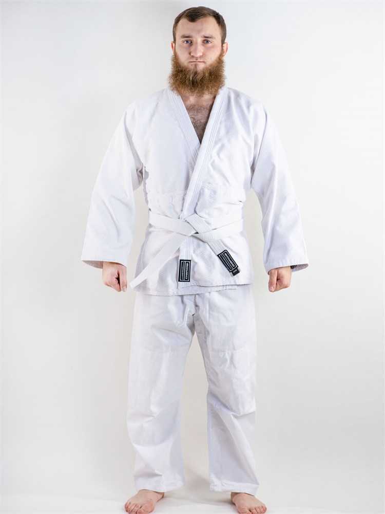 Кимоно дзюдо изготовлено из хлопка, который хорошо впитывает влагу и пропускает воздух. В комплект входит белый пояс, курта и брюки. Места, подверженные наиболее интенсивному воздействию (лацканы, колени, проймы) усилены специальными вставками. Современные лекала обеспечат максимум удобства при движениях спортсмена. Плотность ткани : куртка 425 г/кв.м., брюки 250 г/кв.м.