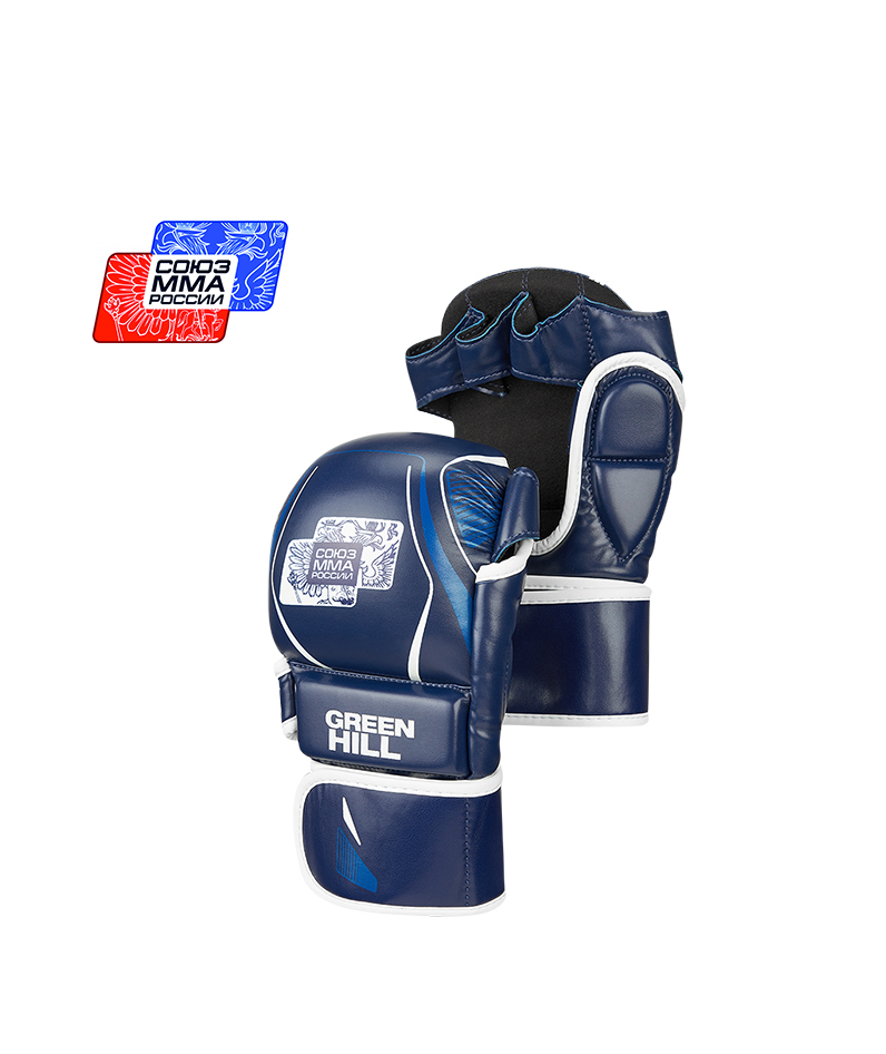 Перчатки ММА для российских турниров по ММА. Обладают толстым наполнителем ударной части для обеспечения безопасности спортсменов и максимально открытой ладонью для облегчения борьбы. Большой палец закрыт и защищен двухсекционным наполнителем из пены. Материал перчаток - искусственная кожа. Крепление на липучке в два оборота.