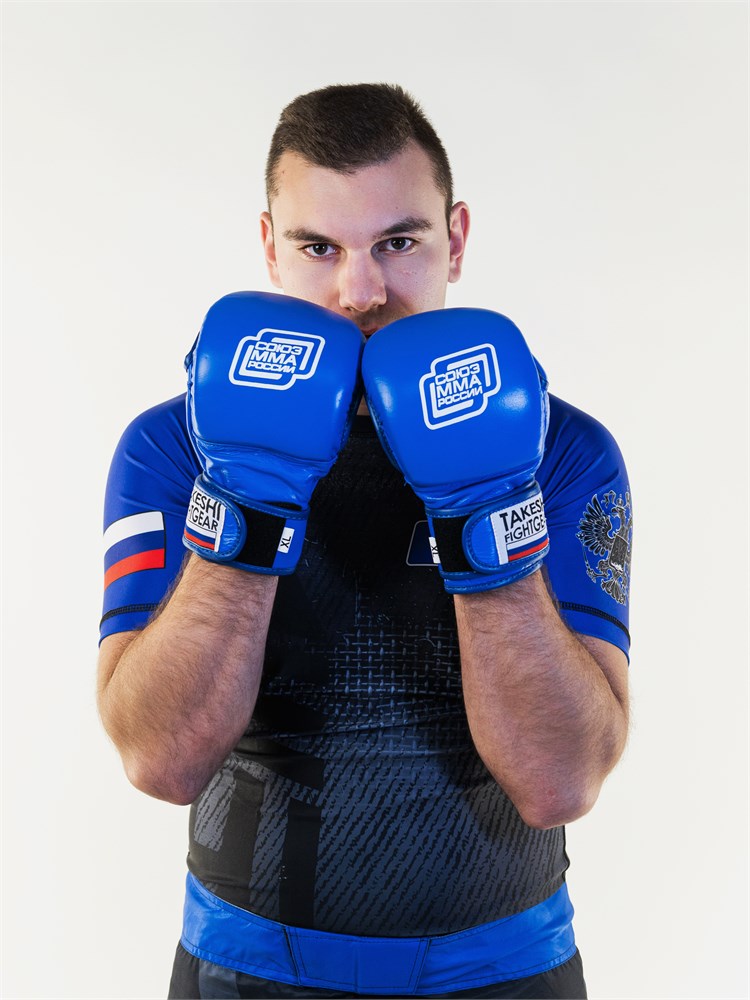 Перчатки боевые Союз ММА России синего цвета. Изготовлены эксклюзивно для Союза ММА. Особое внимание уделено безопасности. Большой палец дополнительно защищен, но в то же время это не мешает при борьбе. Очень удобно надеваются. Манжет перчатки оснащен двойной липучкой. Выполнены из качественных синтетических материалов.