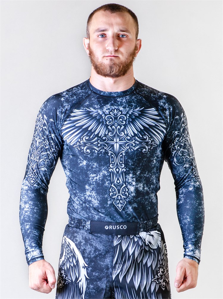 Рашгард для MMA RuscoSport Wings, выполнен из легкой и приятной на ощупь ткани полиэстер, которая обеспечивает максимальный комфорт на тренировках. Имеет компрессионный эффект и способен защищать мышечную систему спортсмена в разогретом состоянии, а также предупредить появление синяков, ссадин и порезов. Швы изделия, выдерживают большие нагрузки и при этом не раздражают кожу спортсмена. Принт рашгарда нанесён на ткань при помощи сублимационной печати, что гарантирует его сохранность после стирки.
