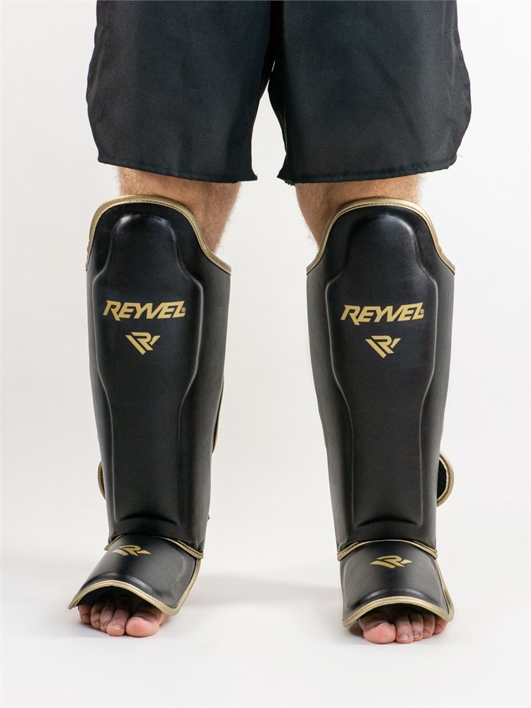 Внешний материал – ударопрочный винил, подкладка выполнена из прочной быстросохнущей ткани. Крепится на ноге двумя широкими застежками на липучке, расположение застежек обеспечивает плотное прилегание и исключает проворачивание во время тренировки, стопа и пятка фиксируются прочными резинками. Защиту голени и стопы обеспечивает трехслойный вкладыш из полимерной пены. Дополнительная накладка на голени защищает большую берцовую кость. Общая толщина в районе кости достигает 28 мм.